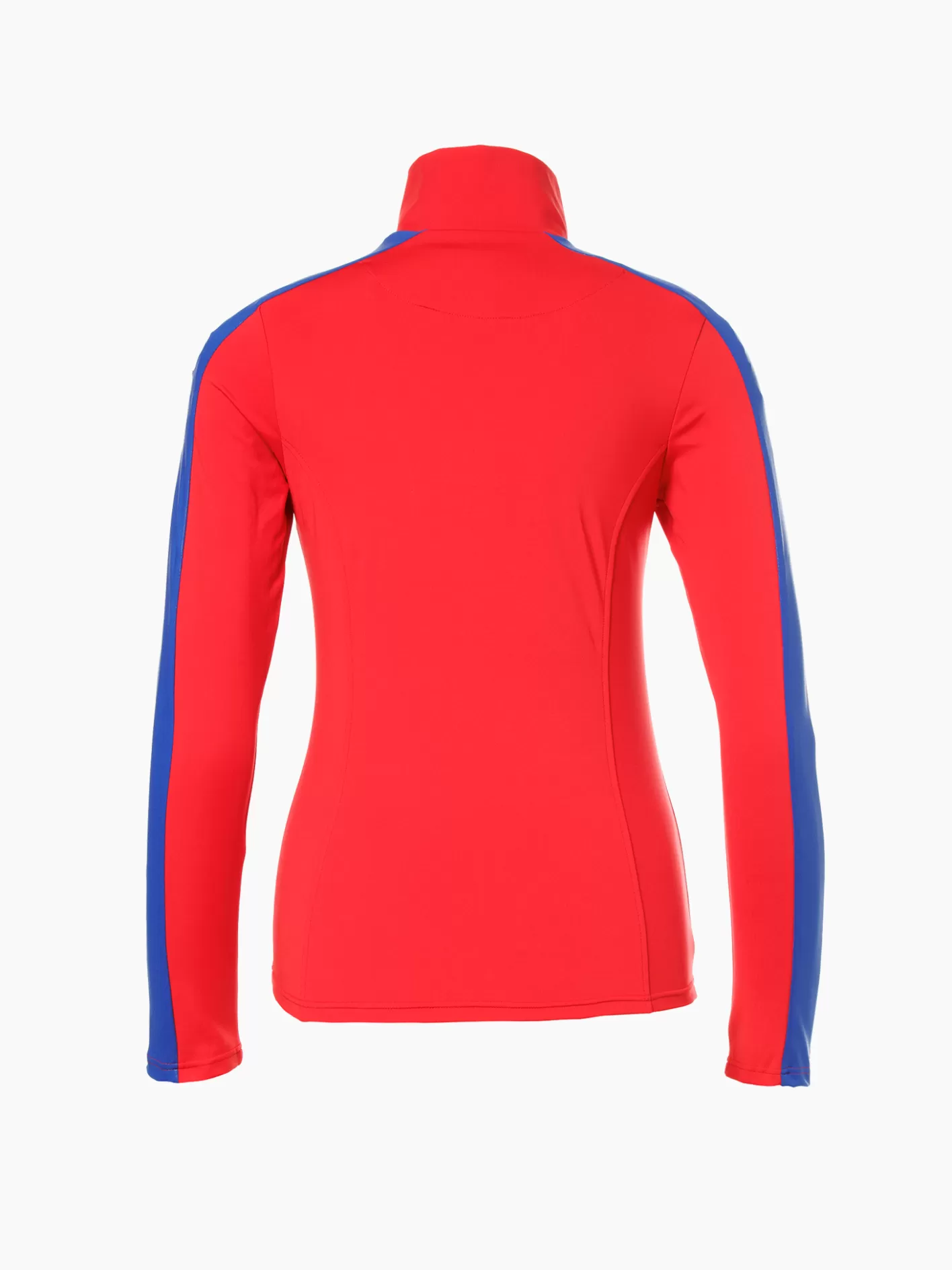 Ski pully met dubbele glanzende streepPowerstretch interlock met een zachte geborstelde achterkantNauwsluitende kraagLan…