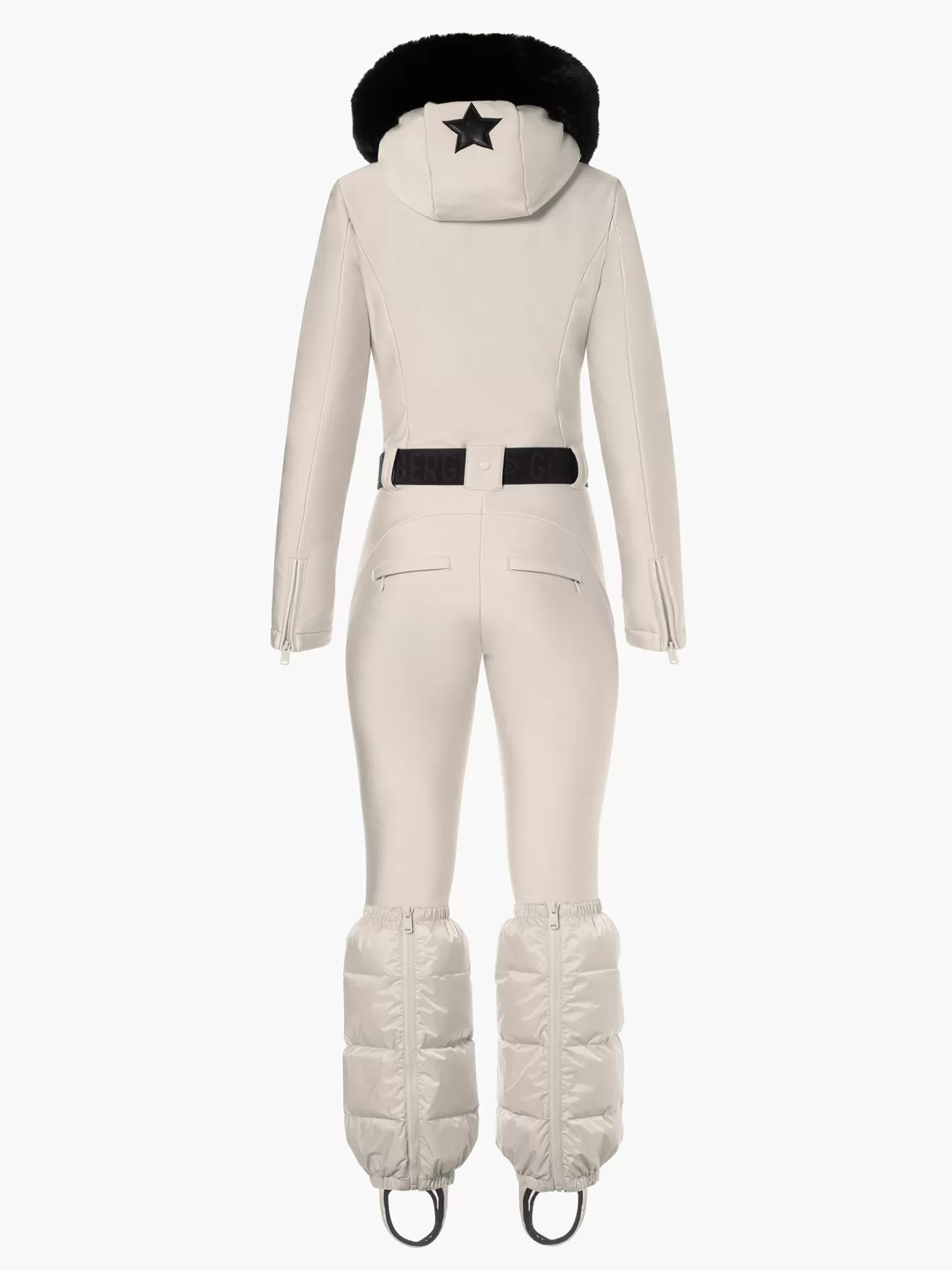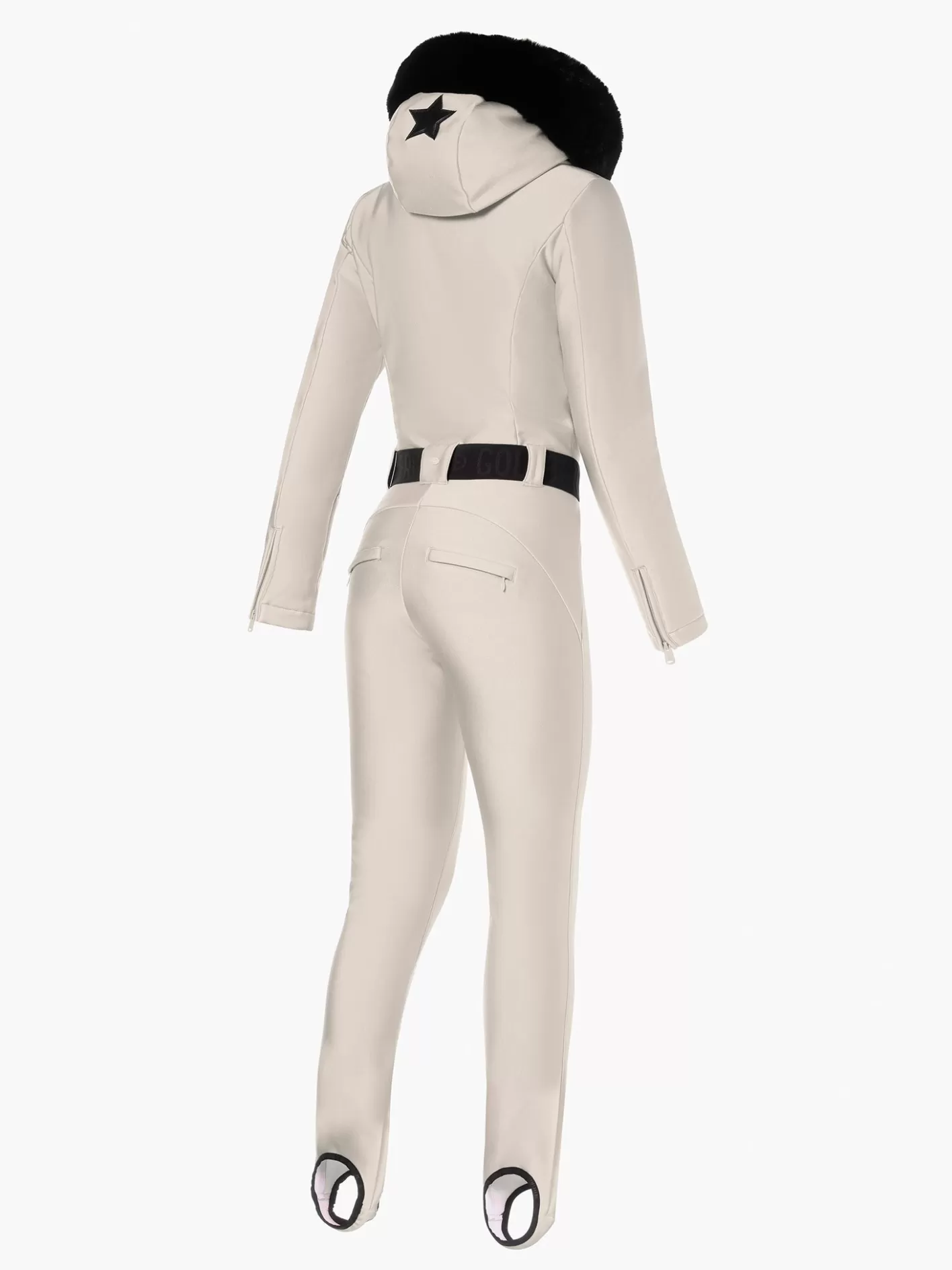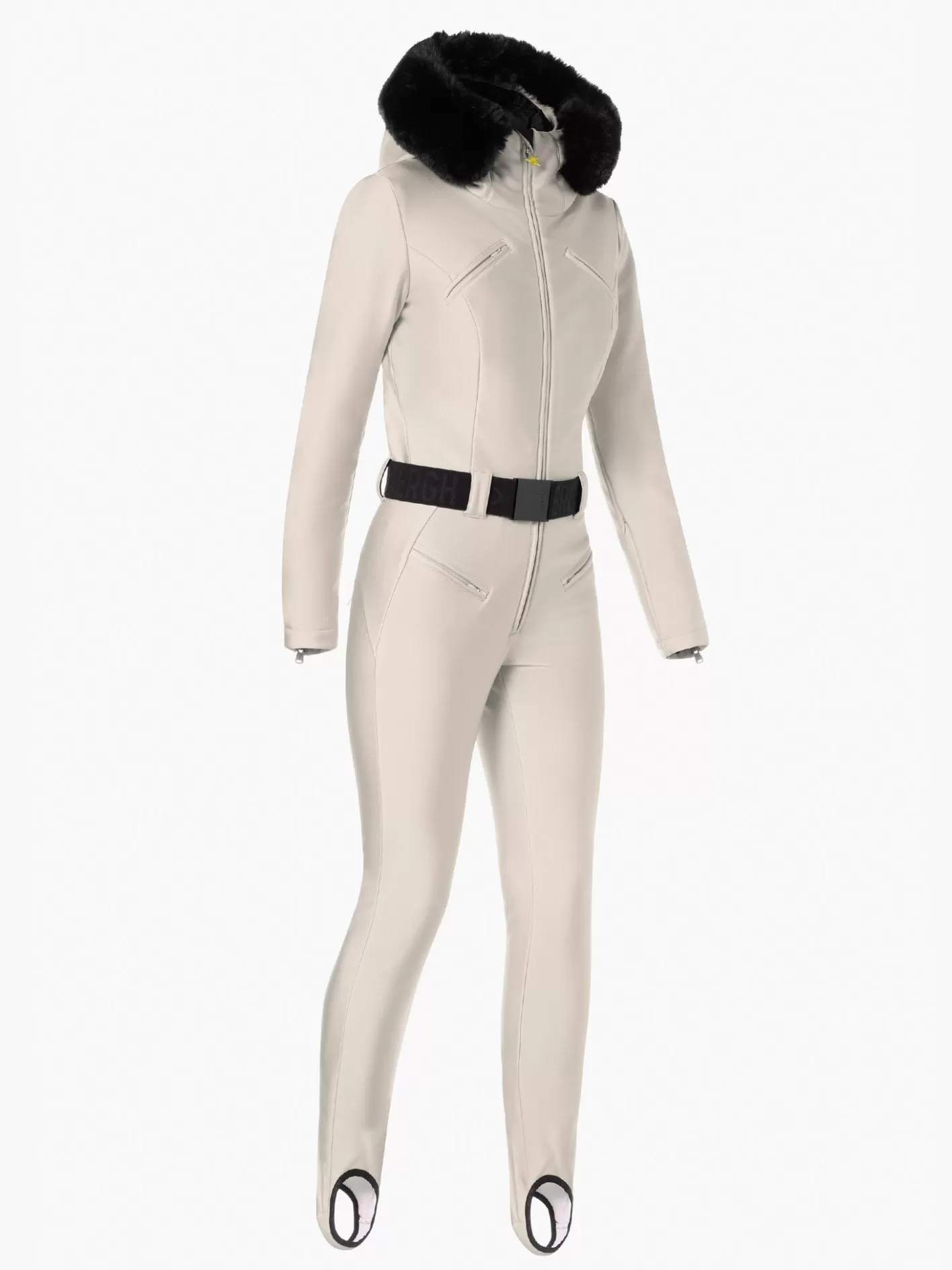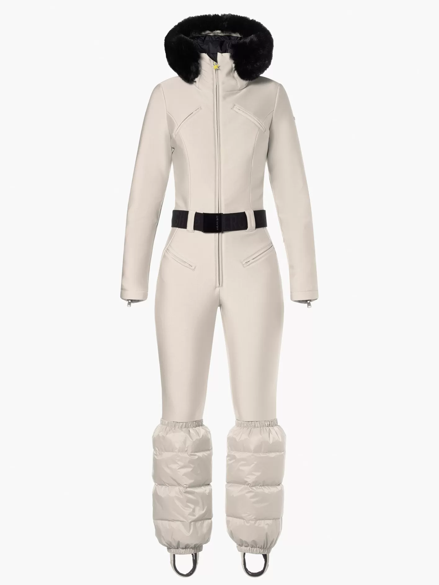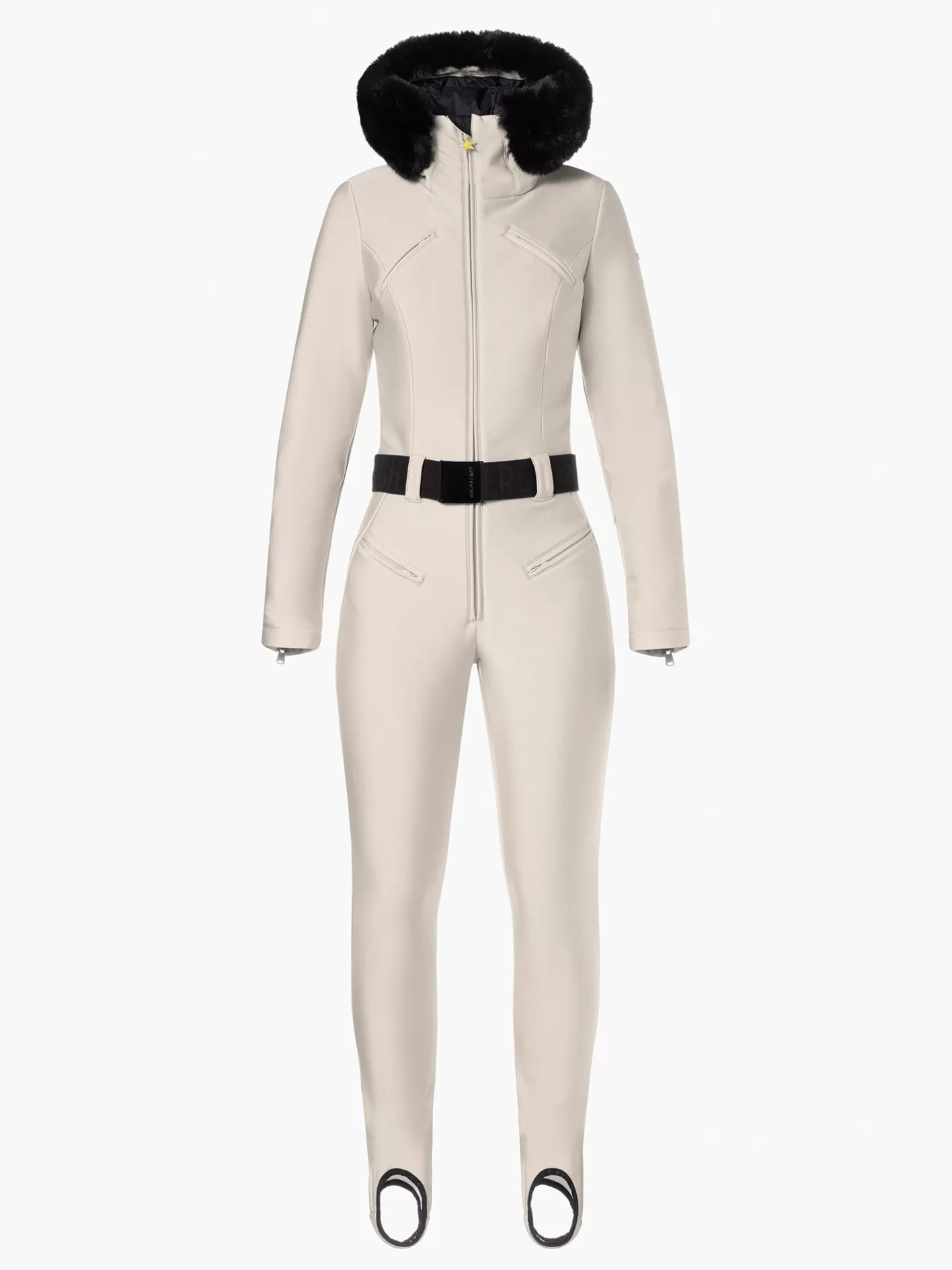 Softshell glanzende skioverall met capuchon, losse sneeuwvangers en faux fur rand